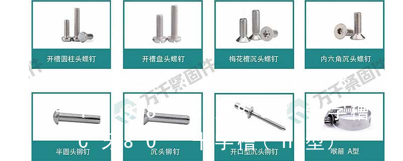 螺栓有:1、方頭螺栓,2、半圓頭方頸螺栓,3、十字槽盤頭螺釘,4、內六角沉頭螺釘,5、方螺母C級,6、蝶形螺母,7、六角頭螺栓,8、十字槽盤頭自攻螺釘。大小有M18、M6、M8、M16、M10、M12、M14、M20等型號。通常用 2、自切自攻螺釘我國標準稱為“自攻螺釘刮削端”,螺紋為自攻螺紋或機螺紋,十字槽也是“H”型。自切自攻螺釘有以下幾種型式:十字槽盤頭自切自攻螺釘,十字槽沉頭自切自攻螺釘。十字槽半沉頭自切自攻螺釘,六角頭自切自攻螺釘。