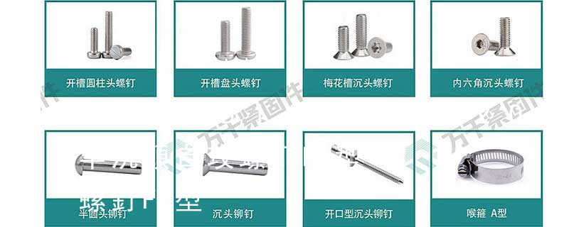 六角花形等;內扳擰:一字槽、十字槽H型、十字槽Z型、十字槽F型、四方槽、復合槽、內花鍵、內六角花形、內三角、內六角、內12角、離合器槽、六葉片型槽、高扭矩十字槽等。3、螺紋種類螺紋種類繁多,有自攻螺紋(
